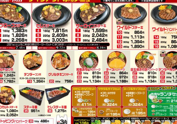 「いきなりステーキ」では、各シーズンごとに特徴的な食材を使用した期間限定のメニューが用意されています。例えば、冬には温かみのある煮込み料理やクリーミーなソースを使ったステーキが登場します。また、夏にはさっぱりとした味わいのグリル野菜や冷たいサラダが人気です。