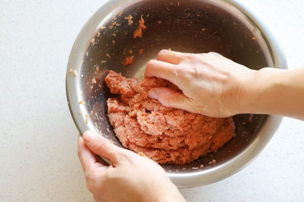 次に、生地を作成します。先ほど用意した牛ひき肉や他の材料と一緒に混ぜ合わせます: