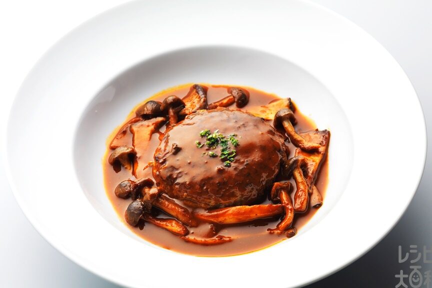 - 最後に再度軽く加熱し、お皿に盛ったハンバーグの上からかけると完成です!美しい色合いとともに、美味しい仕上がりになります。