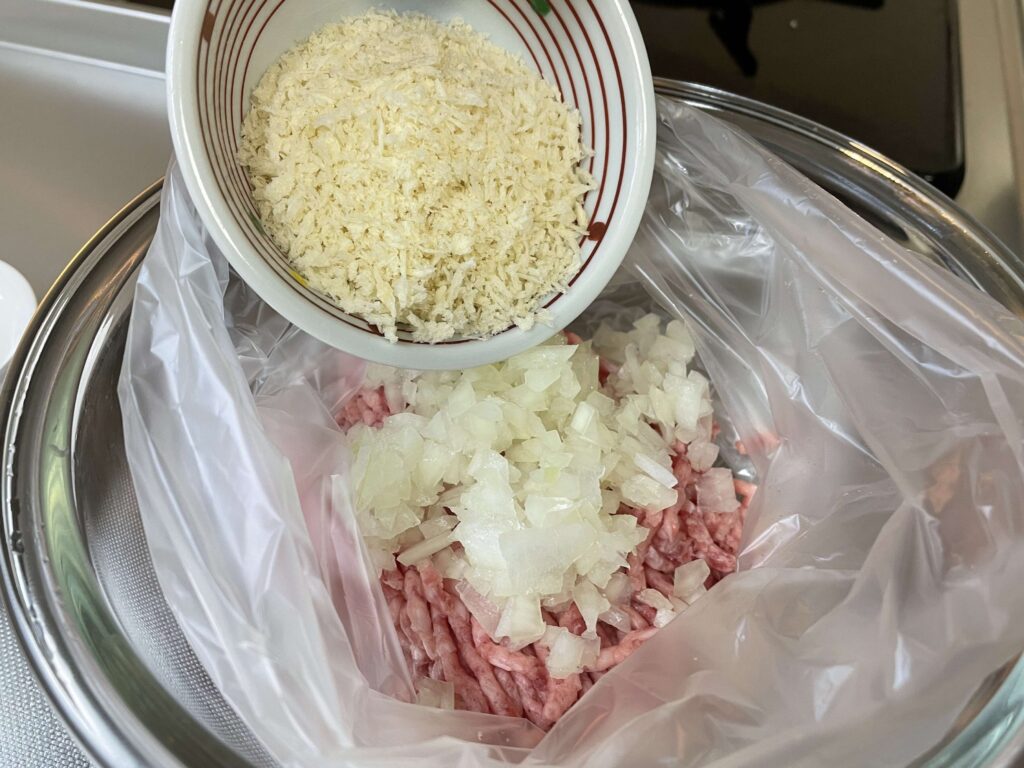 まず、全ての材料をボウルに入れてよく混ぜ合わせます。その後、アイラップで包み込み、中火で蒸し焼きにすることで、旨味と栄養が凝縮された美味しいハンバーグが完成します。この方法では野菜からも水分が出るため、一層ジューシーになります。