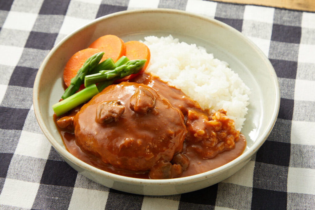最後には、お皿に盛り付けて完成です。サイドメニューとして用意した野菜類や、ご飯ともバランスよく配置すると見映えも良くなります。これこそ、「煮込みハンバーグ ワンプレート」の魅力ですね。