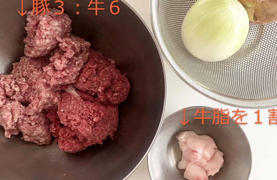 - 準備:玉ねぎを透明になるまで炒めて冷まします。